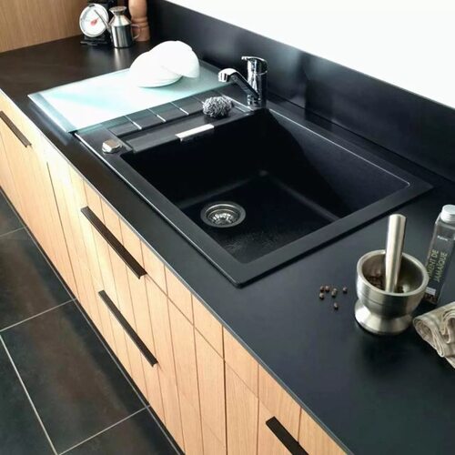 Светлая столешница с черной мойкой создает уникальный визуальный эффект, делая вашу кухню стильной и современной. Она также отлично сочетается с различными цветовыми решениями и материалами, позволяя вам создать интерьер, который подчеркнет ваш индивидуальный вкус.